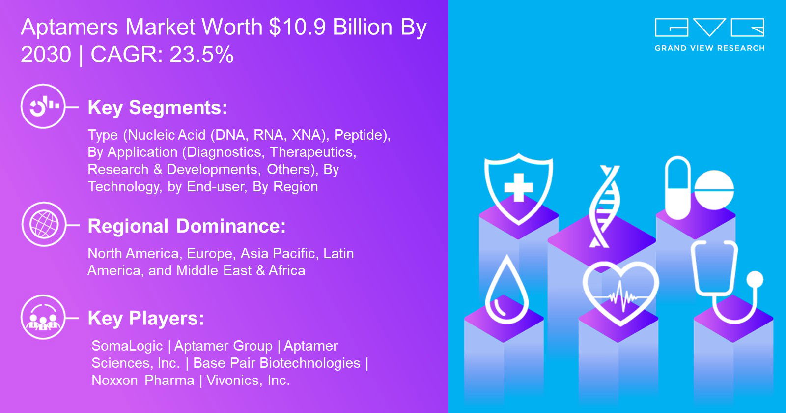 The global Aptamers Market size is expected to reach USD 10.9 billion by 2030, according to a new report by Grand View Research Inc. The market is expected to expand at a CAGR of 23.5% from 2022 to 2030. The growth of the market is attributed to the strong presence of product pipelines and their expected launch during the forecast period. Some of the products in the pipeline are E10030 (Fovista), ARC1905 (Zimura) by IVERIC Bio, Inc., AGRO100 by Antisoma Research Ltd, NOX-A12 (olaptesed pegol) & NOX-E36 (emapticap pegol) by NOXXON Pharma, and NU172 by ARCA Biopharma, Inc. AGRO100 completed the phase 1 clinical trial for multiple oncology indications such as non-small cell lung cancer, solid tumors, and renal cancer.In addition, initiatives undertaken by regulatory agencies such as the U.S. FDA, Health Canada, EMA, COFEPRIS, MHRA, and CDSCO to support the research and development in the field of aptamers are projected to fuel market growth. For instance, in March 2020, IVERIC Bio, Inc. received Fast Track designation from the U.S. FDA for Zimura for the treatment of patients with GA secondary to age-related macular degeneration (AMD). Zimura is a chemically synthesized pegylated RNA aptamer, administered by intravitreal injection. It acts by inhibiting complement factor C5 which is responsible for the development of AMD.Companies are studying aptamers for applications such as western blotting, ELISA, therapeutics, and flow cytometry. Custom aptamer selection is considered to be an important service offered by existing aptamer players to life sciences companies. Thrombin aptamers, cocaine aptamers, and theophylline aptamers are some of the most frequently used customized aptamers for research and development activities. Thus, the surge in numbers of biotech and pharma companies working on research related to aptamers and related technologies has opened up new avenues for the growth of this market.Moreover, there are a number of strategic initiatives undertaken by key players such as mergers & acquisitions, with an aim to expand their current aptamer product portfolio. For instance, in May 2022, Epicore Biosystems acquired Eccrine Systems' intellectual property and assets. This acquisition boosts Epicore’s wearable microfluidic solutions with additional aptamer-based sweat sensor technology from the Eccrine Systems and the University of Cincinnati to its aptamer product portfolio and strengthens the company’s position in the market. This aptamers-based sensor has been demonstrated in stress, pain, and other healthcare management applications.Related Press Release@ Aptamers Market ReportAptamers Market Report Highlights