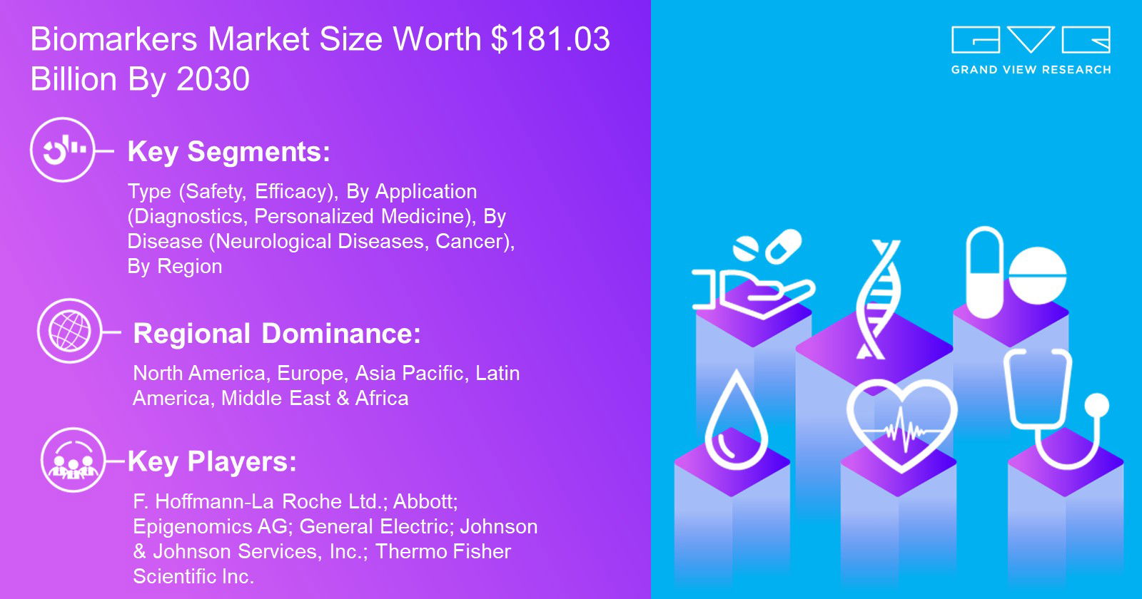 The global Biomarkers Market size is expected to reach USD 181.03 billion by 2030, registering a CAGR of 13.3% over the forecast period, according to a new report by Grand View Research, Inc. The rising R&D investments by pharmaceutical and biotechnology companies, increasing number of Contract Research Organizations(CROs), and declining cost of clinical trials in emerging economies are the major driving factors for the industry. In addition, key players leverage various strategies to increase their production capabilities and promote the outreach of their product offerings. In June 2022, Paige announced its collaboration with Janssen to evaluate the potential of an (H&E)-based, (AI)-powered biomarker test, developed by Janssen, to screen for actionable FGFR3 and FGFR2 genomic alterations in patients with bladder cancer.