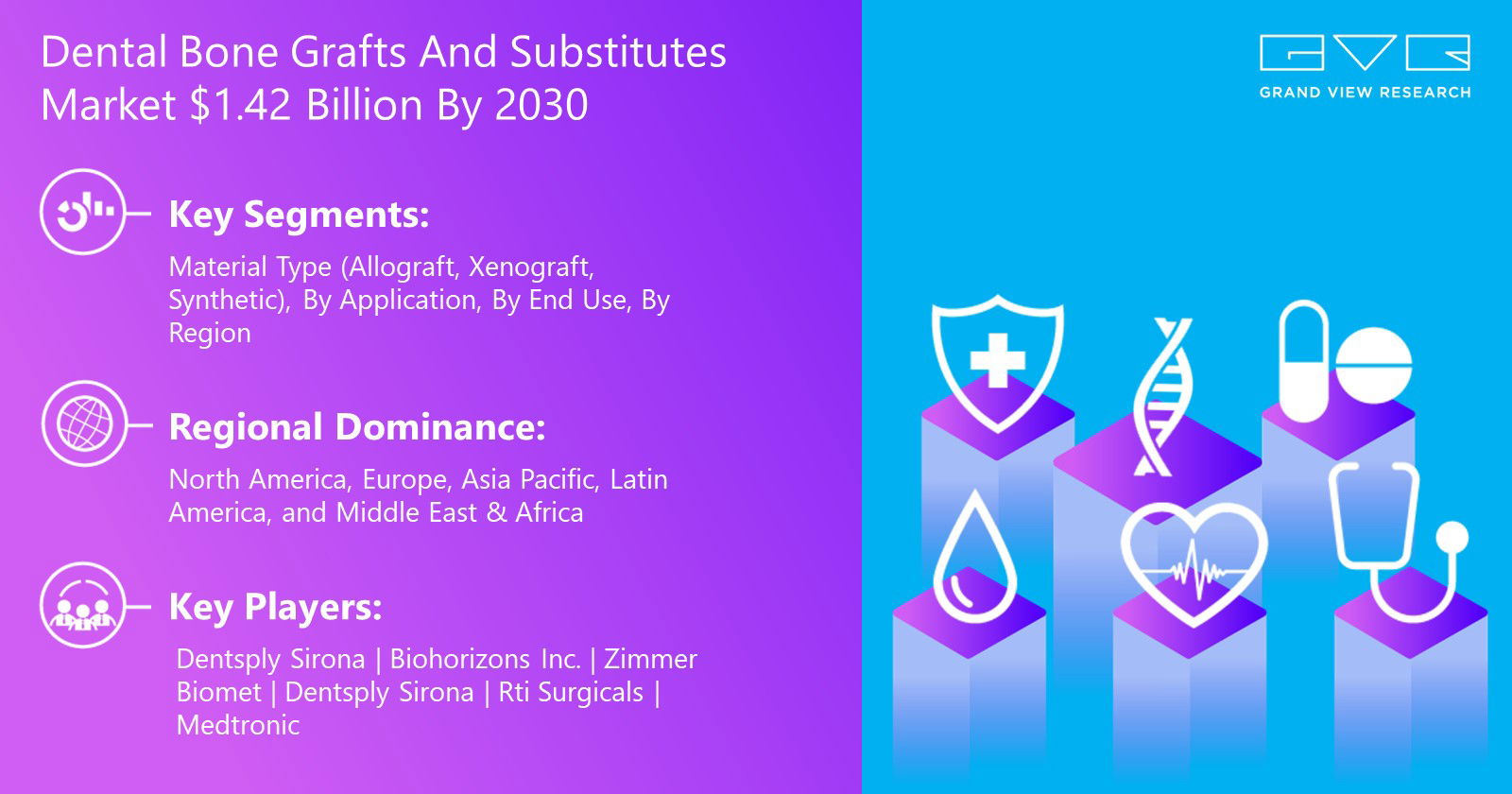 The global Dental Bone Grafts And Substitutes Market size is expected to reach USD 1.42 billion by 2030, registering a CAGR of 9.4% from 2022 to 2030, according to a new report by Grand View Research, Inc. The increasing number of dental implant surgeries, the growing target population, technological advancement in synthetic bone grafts, and new product launches are the major growth propelling factors for the market. According to the Population Reference Bureau 2018 statistics, by 2050, from 13 countries to around 82 countries across the world are anticipated to have more than 20% of the geriatric population (65 years and above). Thus, perpetual growth in the population aged 60 years and above is anticipated to result in an increased prevalence of periodontal diseases. These aforementioned factors are driving the market.