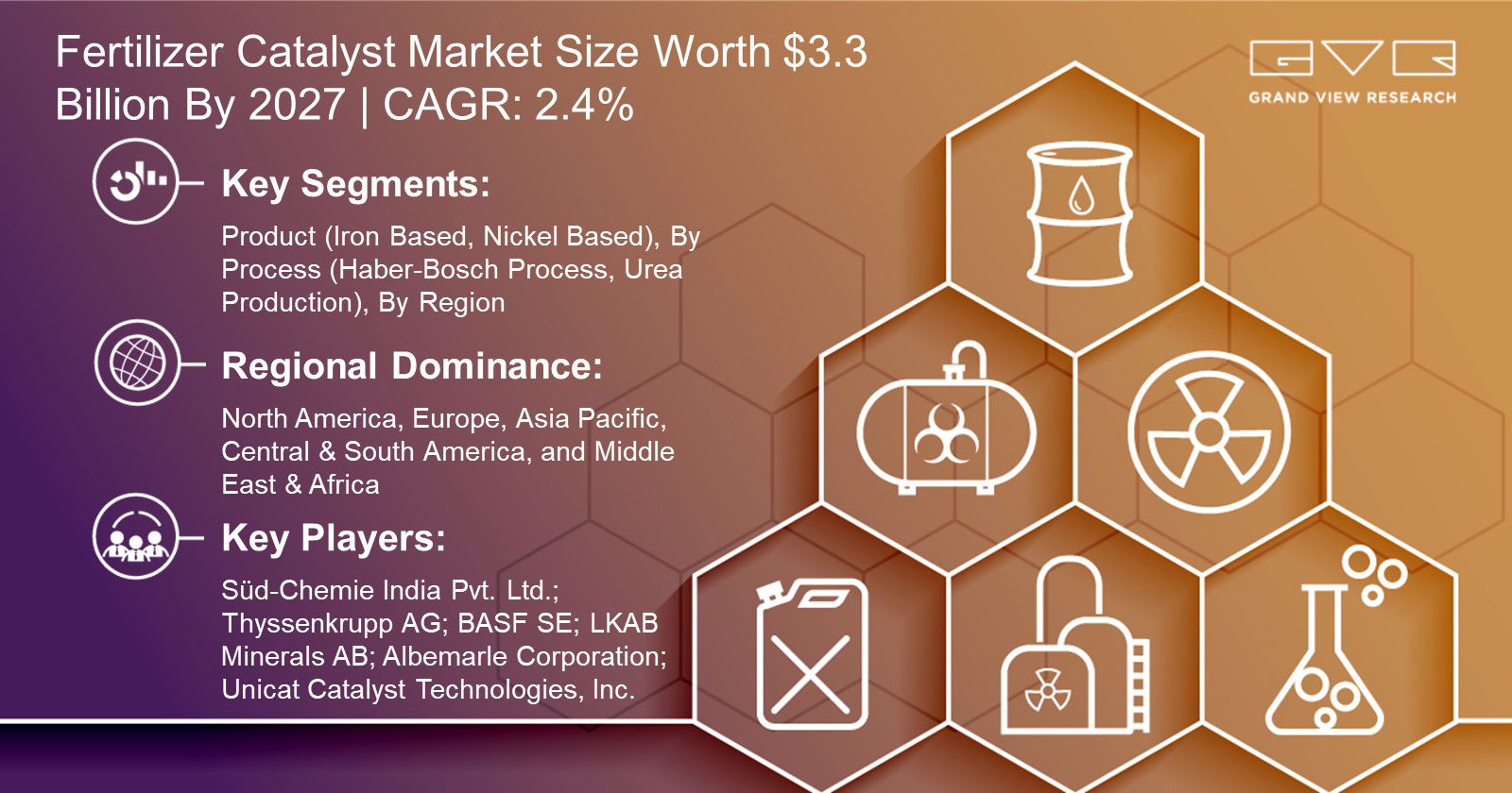 The global Fertilizer Catalyst Market size is expected to reach USD 3.3 billion by 2027, according to a new report by Grand View Research, Inc. It is expected to expand at a CAGR of 2.4% from 2021 to 2027. The market is expected to be driven by the growing application in the production of fertilizers and the need for improving process efficiencies.