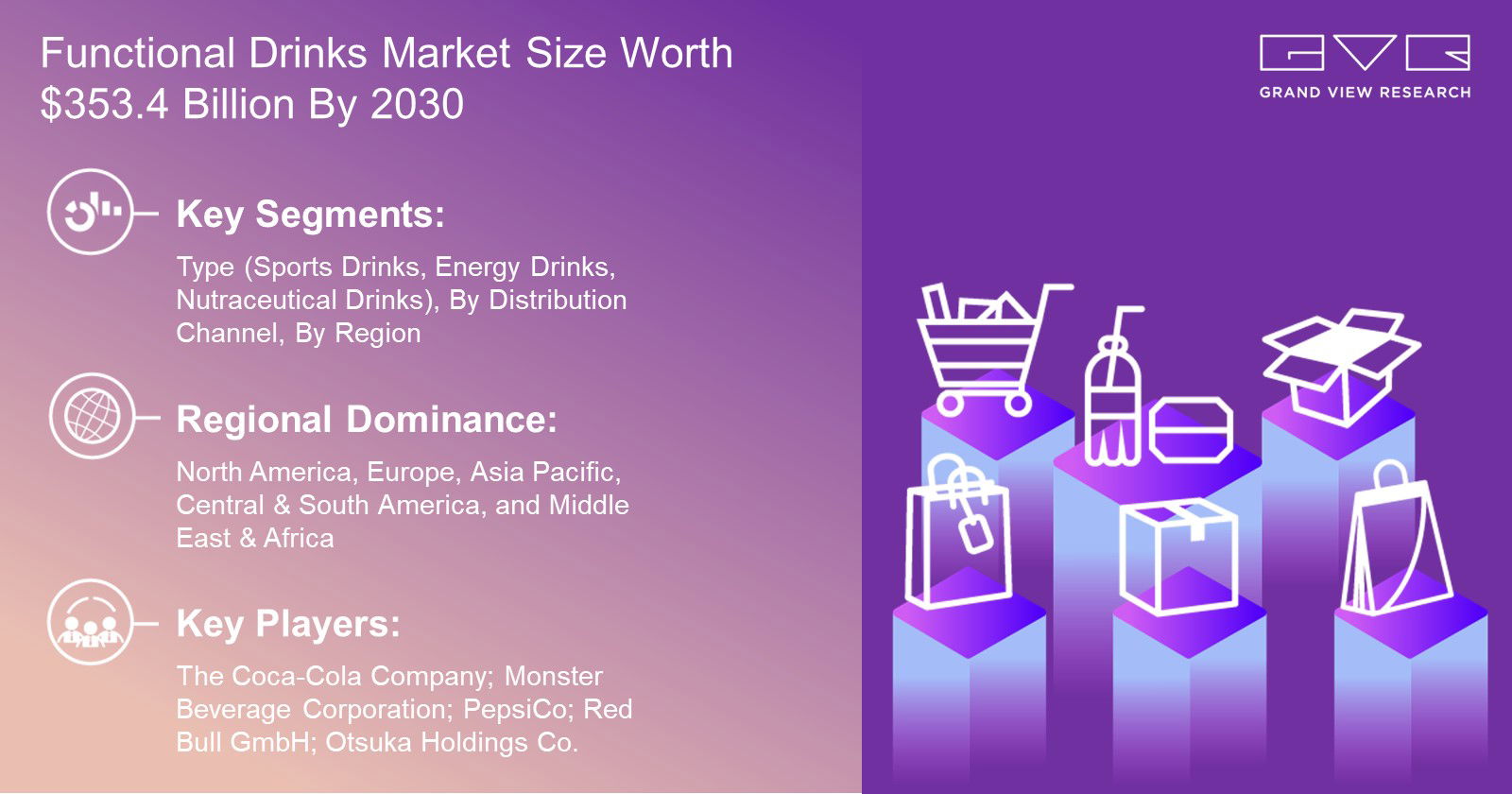 The global Functional Drinks Market size is expected to reach USD 353.4 billion by 2030, registering a CAGR of 7.1% from 2023 to 2030, according to a new report by Grand View Research, Inc. Rising health awareness in several countries, globally, has prompted consumers to switch from regular soft drinks with high sugar content to healthier substitutes with functional ingredients that provide health benefits.