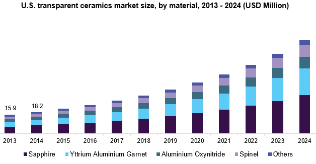 The global Transparent Ceramics Market size is expected to reach USD 1.1 billion by 2024, according to a new report by Grand View Research, Inc. It is projected to expand at a CAGR of 22.4% over the forecast period. Rising demand for optic and optoelectronics is anticipated to fuel the market demand over the forecast period.