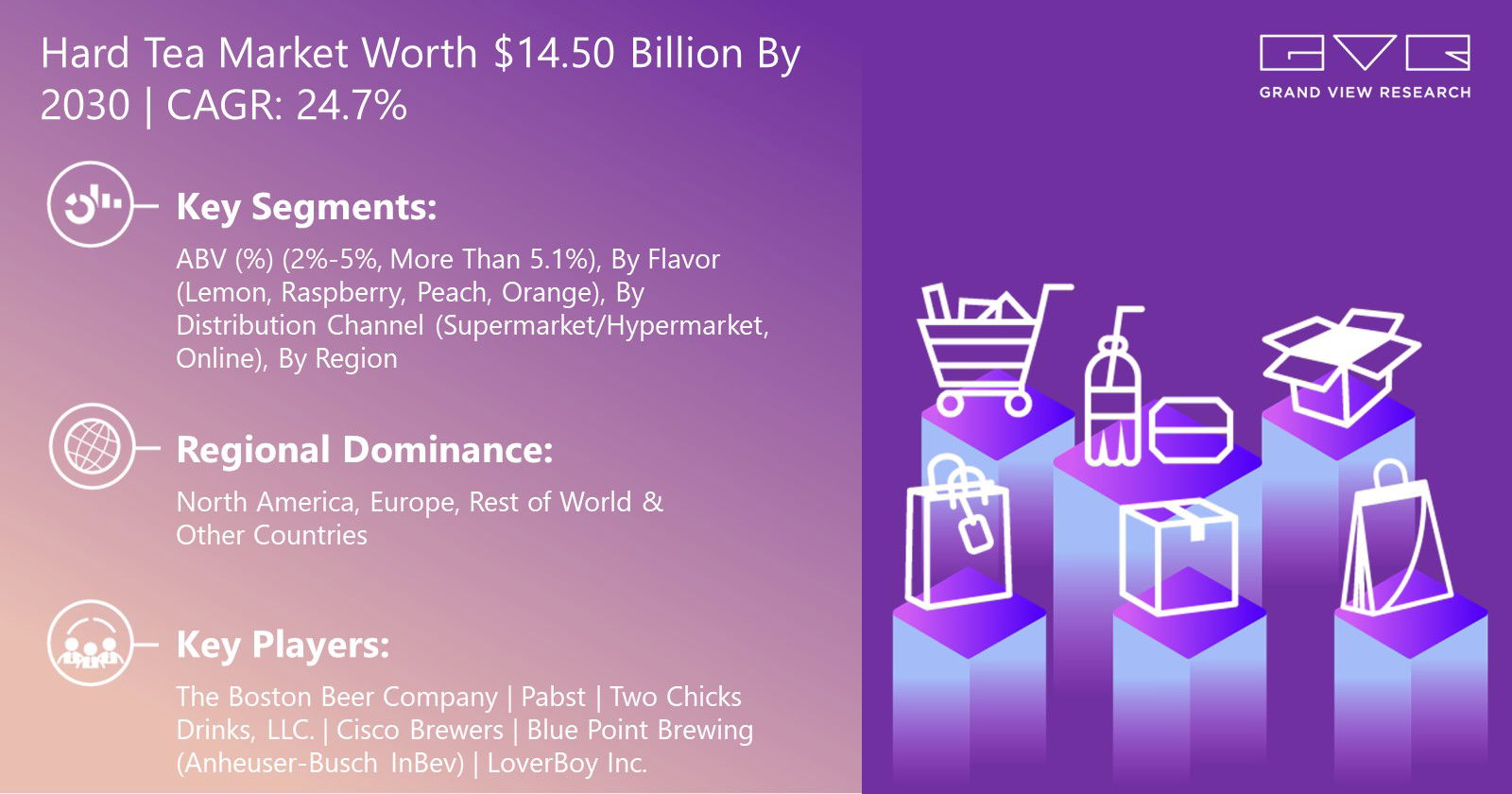 The global Hard Tea Market size is expected to reach USD 14.50 billion by 2030, registering a CAGR of 24.7% over the forecast period, based on a new report by Grand View Research, Inc. Consumers’ shift from unhealthy drinking and eating habits toward low-calorie food and beverages is driving the demand for hard teas. Brands operating in the hard tea market are launching beverages that have low-alcohol content. Growing awareness towards reducing alcohol intake is acting as an opportunity for manufacturers to provide beverages with botanical ingredients to provide a healthier image to spiked hard teas.