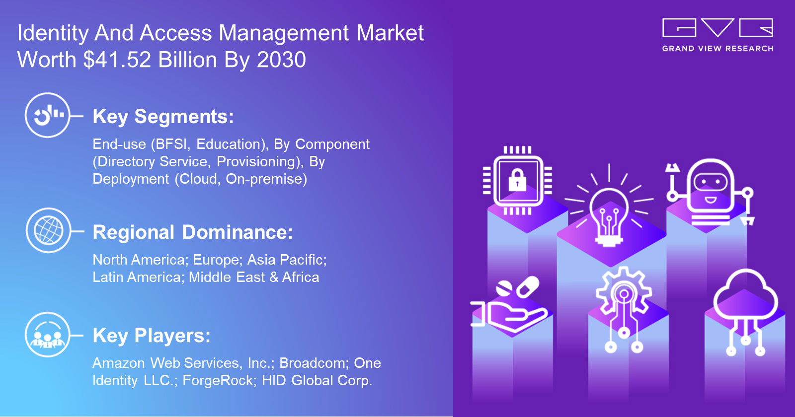 The global Identity And Access Management Market size is anticipated to reach USD 41.52 billion by 2030, registering a CAGR of 12.6% over the forecast period, according to a new study by Grand View Research Inc. Identity and access management (IAM) is a security discipline that ensures the right entities to use the right resources (data or apps). Advancements in the internet of things (IoT) and artificial intelligence (AI), rising awareness about regulatory compliance management, and increasing reliance on digital platforms & automation across industries are anticipated to drive the industry over the forecast period. The integration of IAM solutions and MDM is anticipated to drive market growth over the forecast period.The rising fraudulent and cybercrime activities are driving enterprises to implement IAM systems as a result of the rapid adoption of the cloud and the advancement of new technologies, such as AI and ML. IAM uses identity analytics and intelligence to monitor unusual user account activity.Furthermore, IAM systems reduce the cost of services, such as outsourcing, among others. Hence, the rising enterprise identity and security concerns and the elimination of service costs drive the growth of the industry over the forecast period. Furthermore, high installation costs of identity and access management systems are expected to stifle the growth of the industry over the forecast period. The identity and access management industry is adopting the latest IAM business technologies as capital technology. These technologies have increased market opportunities for identity and access management which have been purchased and implemented in recent years. IAM contracts' market revenue necessitates extensive implementation. Hence, cloud-based IAM services and technology are becoming more accessible by the day which creates opportunities for market growth over the forecast period.Identity And Access Management Market Report Highlights