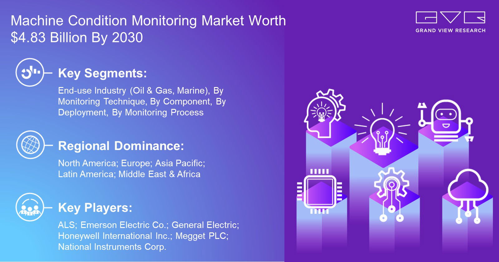 The global Machine Condition Monitoring Market size is expected to reach USD 4.83 billion by 2030, according to a new report by Grand View Research, Inc. The industry is anticipated to grow at a lucrative CAGR of 7.3% from 2022 to 2030. An exponential demand for monitoring services to avoid machinery failure will propel the penetration of condition-monitoring systems. End-users have exhibited an unprecedented demand for predictive maintenance tools to bolster asset life, minimize machine failure and reduce maintenance costs. Stakeholders envisage revenue-boosting potentials in maintaining machine health and reducing downtime with advanced software and tools. The emergence of the Industrial Internet of Things (IIoT) has propelled the measurements, such as pressure, vibration, and temperature.
