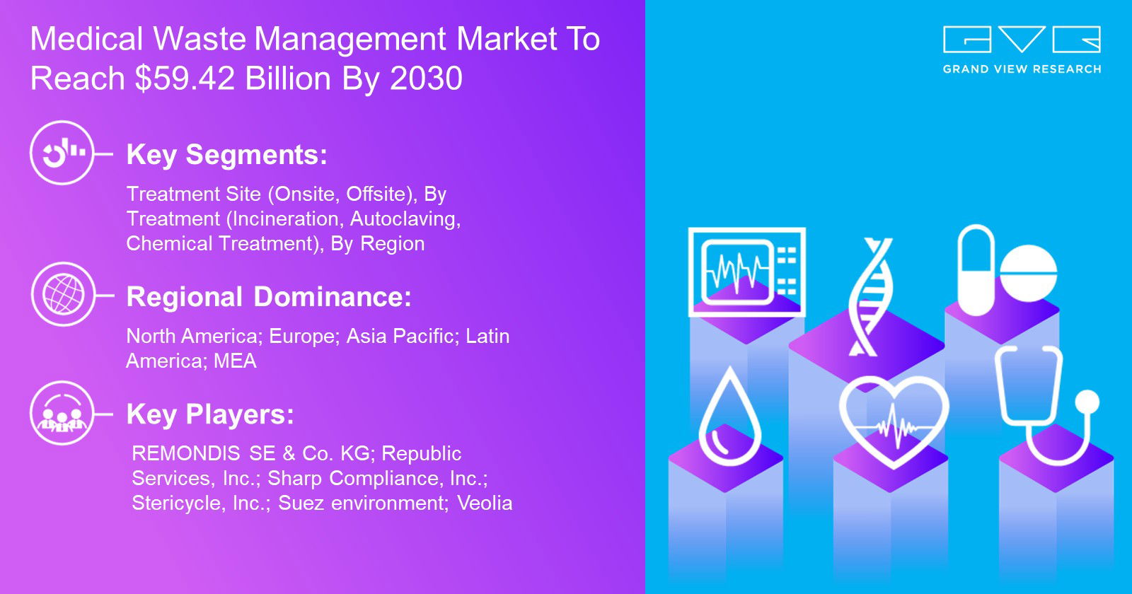 The global Medical Waste Management Market size is expected to reach USD 59.42 billion by 2030, registering CAGR of 8.0% from 2024 to 2030, according to a new report by Grand View Research, Inc. The development of innovative manufacturing techniques in pharmaceuticals, medical devices is growing at a rapid pace. The rise in hospitals, multispecialty clinics, and diagnostic centers that require a large number of inventories for day to day functioning is also leading to the generation of more waste. Thus, overall growth in the healthcare industry coupled with the rising patient population requiring to prolong medical and surgical aid is fueling the market growth.