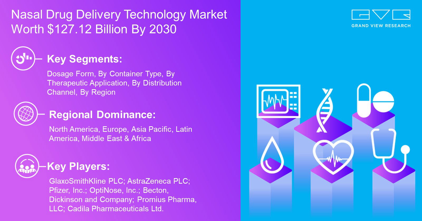 The global Nasal Drug Delivery Technology Market was valued at USD 127.12 billion in 2022, expanding at a CAGR of 7.45% from 2023 to 2030, according to a new report by Grand View Research, Inc. Growing awareness regarding nasal products is one of the major factors driving the market.