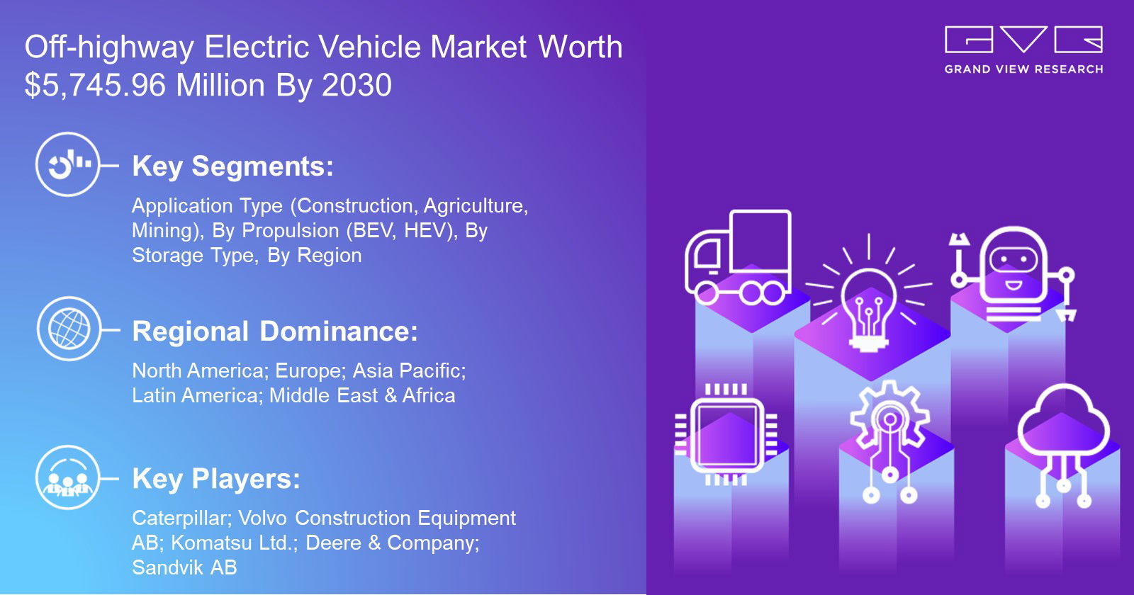 The global Off-highway Electric Vehicle Market size is expected to reach a valuation of USD 5,745.96 million by 2030, growing at 14.1% CAGR from 2023 to 2030, according to a new study by Grand View Research Inc. The commencement of redevelopment initiatives and expanding infrastructural advancements in developing nations are the key drivers fueling the off-highway electric vehicle industry’s expansion.