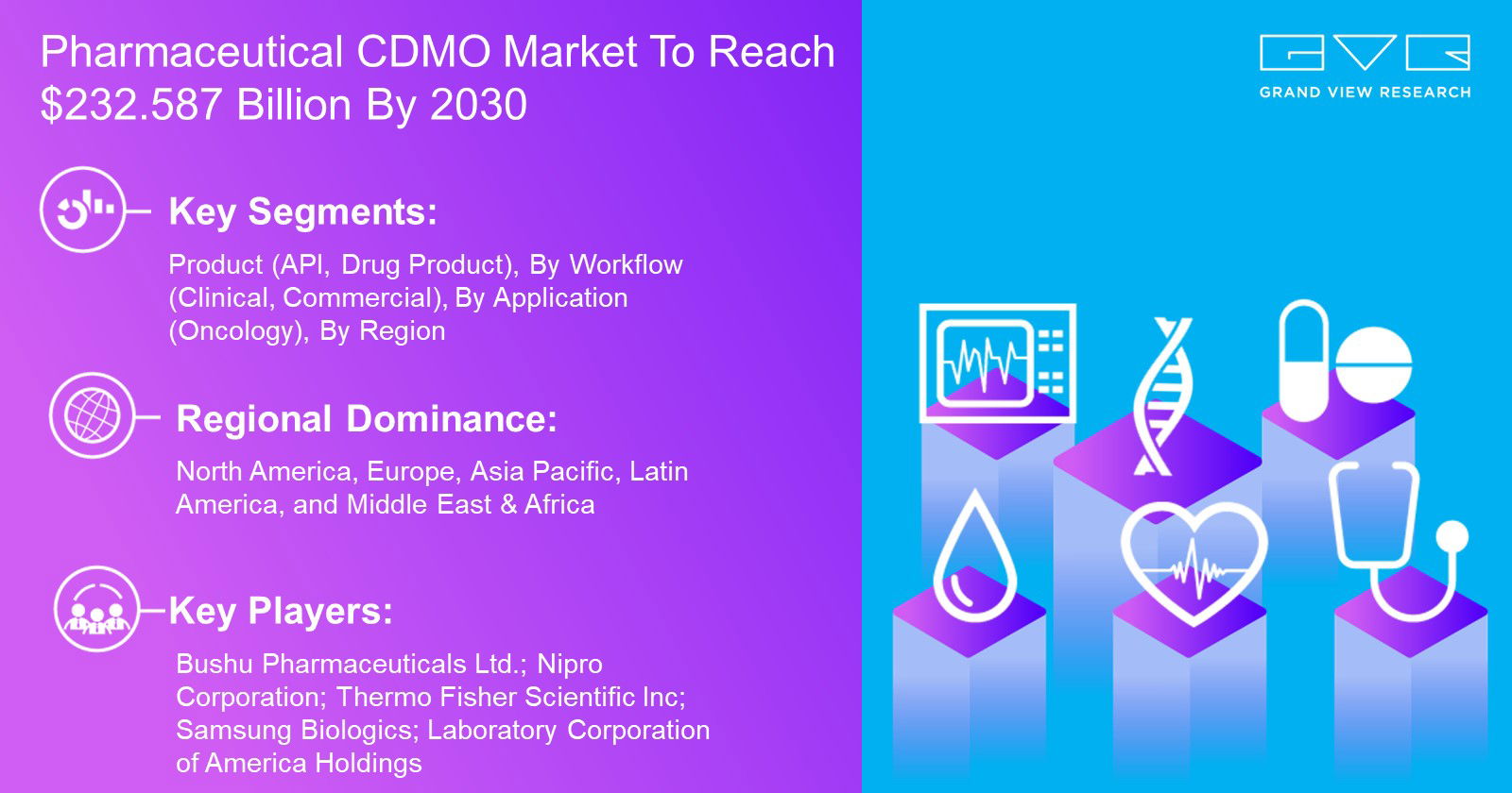 The global Pharmaceutical CDMO Market size is expected to reach USD 232.587 billion by 2030, registering a CAGR of 6.1% over the forecast period, according to a new report by Grand View Research, Inc. increasing demand for biologics, growing outsourcing of drug development and manufacturing activities, and rising investments in research and development (R&D) by pharmaceutical and biotechnology companies as key drivers of market growth. Additionally, the report highlights the emergence of small and mid-sized pharma and biotech companies and the shift towards personalized medicine as further factors expected to drive the market forward.