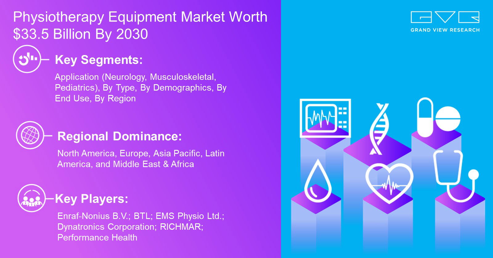 The global Physiotherapy Equipment Market size is expected to reach USD 33.5 billion by 2030, registering a CAGR of 6.95% from 2023 to 2030, according to a new report by Grand View Research, Inc. The growing prevalence of neurological, musculoskeletal, and spinal cord disorders, early disease diagnosis, and awareness about physiotherapy are some of the factors driving the market growth. The rising incidences of sports injuries, cerebrovascular diseases, and degenerative joint disorders are also contributing to the market growth. According to the National Safety Council (NSC), biking was responsible for 426,000 injuries in 2020, the most of any sport or recreational activity. With roughly 378,000 injuries, (with or without equipment) exercise ranked second, followed by ATV, minibike, and moped use (with 230,000 injuries) and scooter, hoverboard, and skateboard use (with 218,000 injuries) in the U.S.