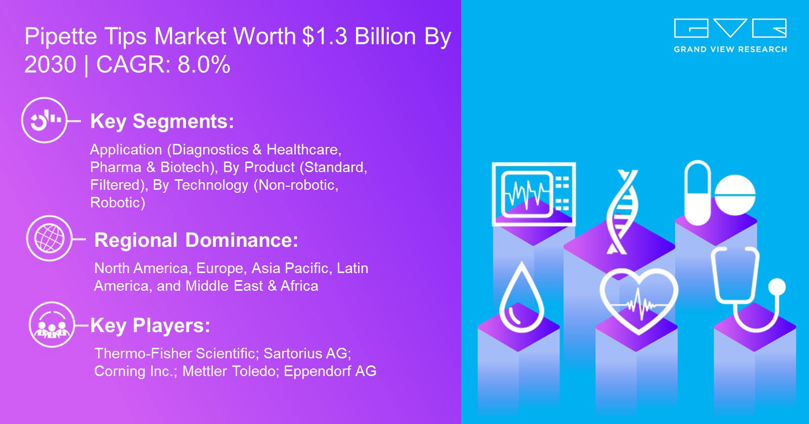 The global Pipette Tips Market size is anticipated to reach USD 1.3 billion by 2030, according to a new report by Grand View Research, Inc., expanding at a CAGR of 8.0% over the forecast period. The rise in demand for advanced liquid handling systems is boosting the market growth. The rising incidence of newer medical conditions is increasing the requirement for more R&D efforts as well as the demand for advanced automated laboratory medical devices in countries, such as the U.S. and Canada, which is among the major factors driving the market growth. The introduction of automated and robotic pipettes and their growing use in pharma and biotech, diagnostics and healthcare, academics, and education industries are also expected to drive the market during the forecast period.