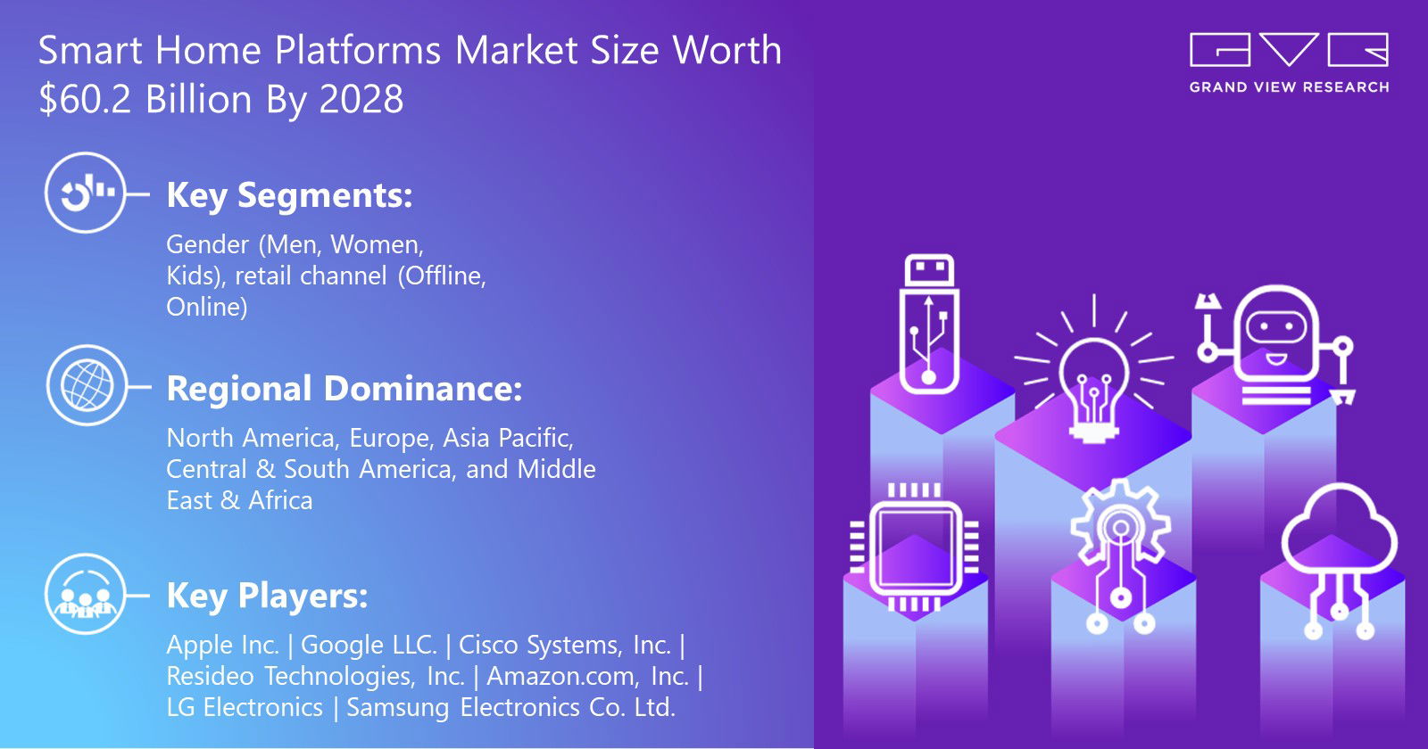 The global Smart Home Platforms Market size is expected to reach USD 60.2 billion by 2028, according to a new report by Grand View Research, Inc. It is expected to expand at a CAGR of 16.9% from 2022 to 2028. Improved experience gained by the users owing to the integration of smart home platforms is the key factor fueling the growth of the market. In addition, the use of smart home platforms allows remote control, thereby further driving the market. Concerns related to the security breach and unauthorized access to personal information and connected device of users is the major restraint for the market. Most of the key players operating in the market are adopting strategies such as adding new features to the platform, along with the development of new platforms that are compatible with various smart devices to capture maximum market share globally.