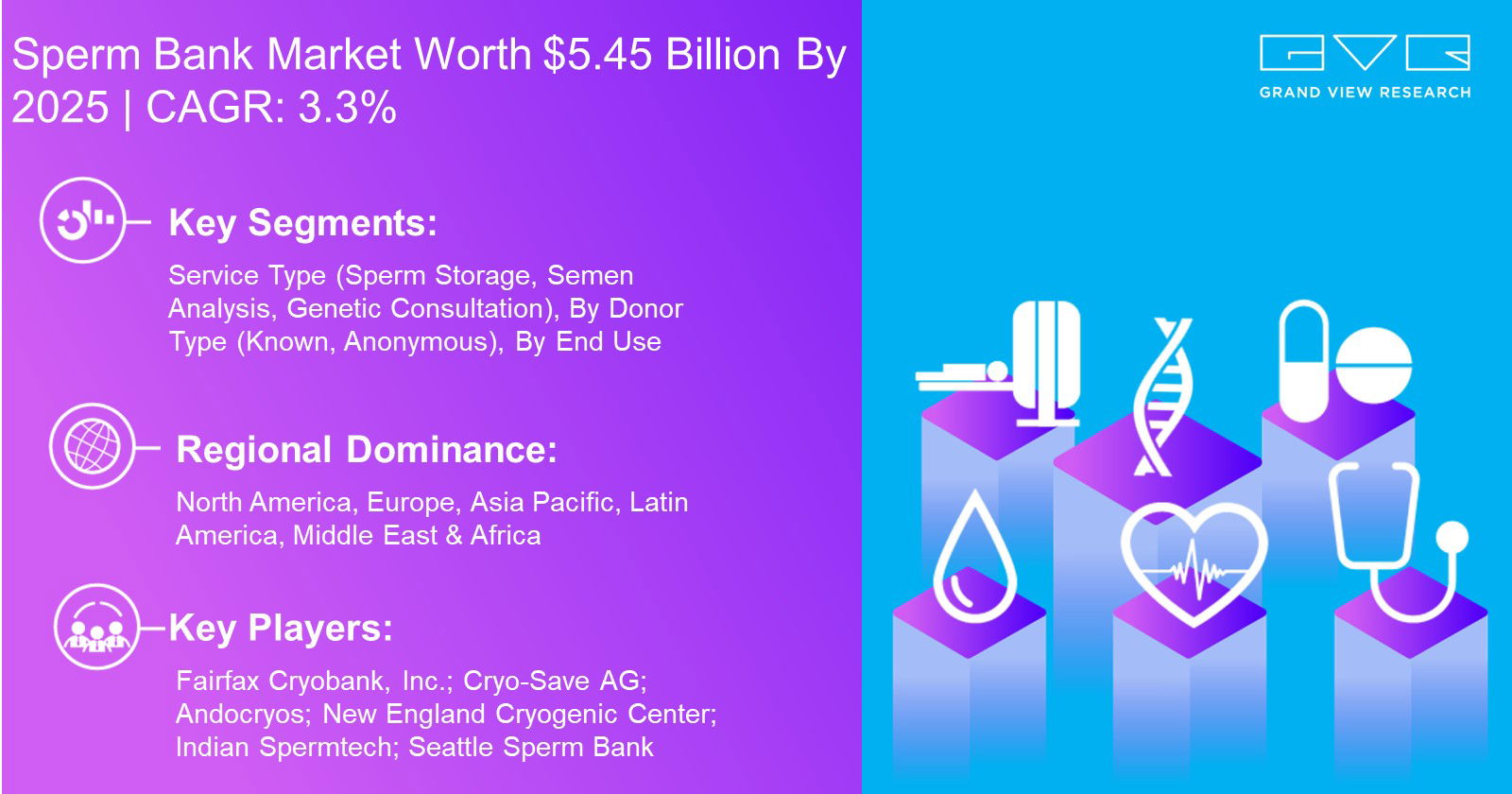 The global Sperm Bank Market size is expected to reach USD 5.45 billion by 2025, at a CAGR of 3.3% over the forecast period, according to a new report by Grand View Research, Inc. The market is majorly driven by increasing incidence of male and female infertility, rising acceptance of sperm banking services, and government initiatives in Assisted Reproductive Techniques (ART). Increasing cases of miscarriage is also one of the key growth contributors.