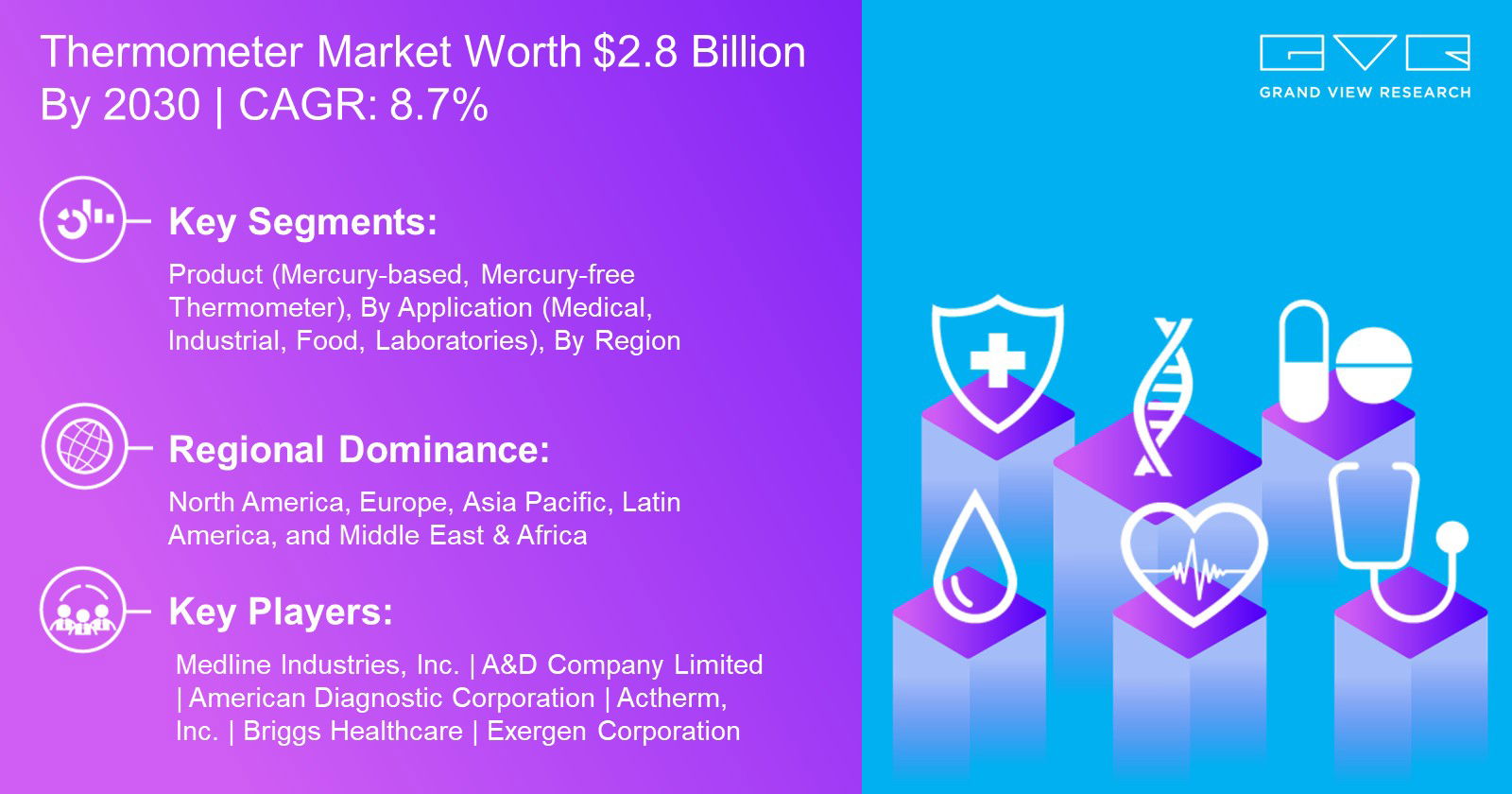 The global Thermometer Market size is anticipated to reach USD 2.8 billion by 2030, according to a new report by Grand View Research, Inc. The market is expected to expand at a CAGR of 8.7% from 2022 to 2030. Increase in demand for accurate medical devices and requirement of specific temperature conditions influences market growth. Rising cases of medical ailments involving accurate measurement of body temperature for the treatment planning, and requirement of specific temperature conditions in various industries is likely to heighten demand for thermometers during the forecast period. Rise in health consciousness coupled with increase in healthcare expenditure is also anticipated to fuel market growth further in coming decade.