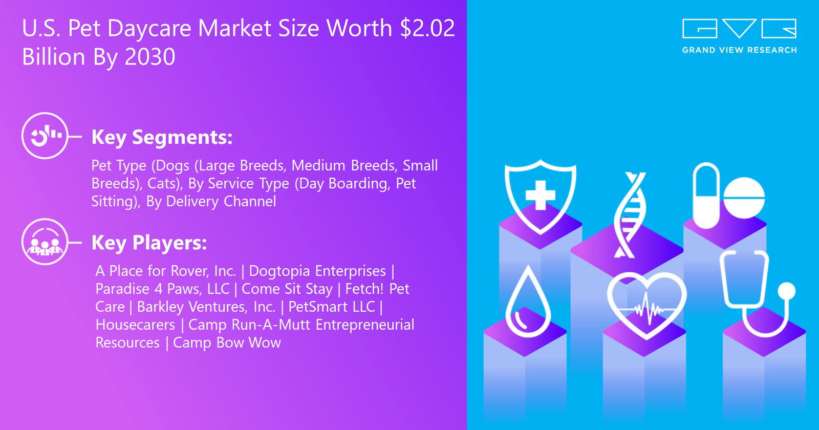 The U.S. Pet Daycare Market size is anticipated to reach USD 2.02 billion by 2030, according to a new report by Grand View Research, Inc. The market is expected to expand at a significant CAGR of 6.8% from 2022 to 2030. The key factors driving the market growth include an increasing number of pet owners and spending on pets. For instance, in 2021, Americans spent around USD 123.6 billion on pets according to the American Pet Products Association. This number was notably greater than expenditure in 2020.The COVID-19 pandemic adversely impacted the market growth, due to the movement restrictions leading to temporary closures of pet daycare centers while pet parents working from home led to low demand for daycare services. At the start of the pandemic, key service providers witnessed a significant drop in appointments and payment volume. For instance, Rover, a pet-care start-up, laid off 41% of its employees just weeks after the lockdown began. This was due to the economic impact and uncertainty affecting its pet sitting business among others due to the pandemic. The company put 9% of staff on standby. Despite the low demand, the company continued to offer pet sitting services while adhering to social distancing and stay-at-home mandates.