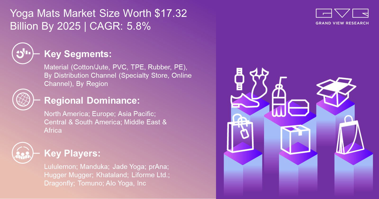 The global Yoga Mat Market size is anticipated to reach USD 17.32 billion by 2025 registering a CAGR of 5.8%, according to a new report by Grand View Research, Inc. Supportive government initiatives to promote yoga across the world will fuel the product demand over the forecast period. Rising number of yoga studios due to growing popularity of the technique in countries including U.S., China, and Australia is also expected to boost the product demand in the coming years.